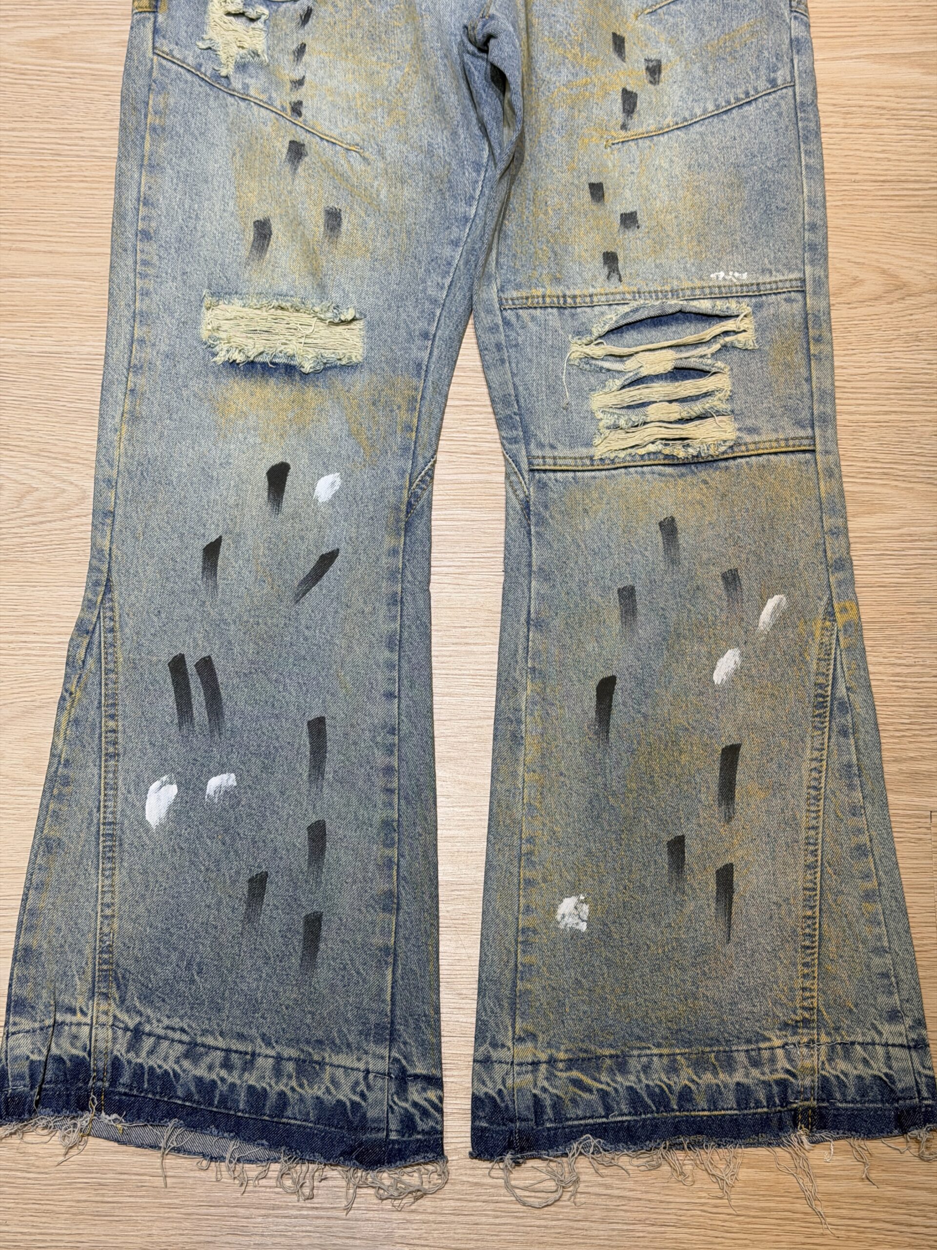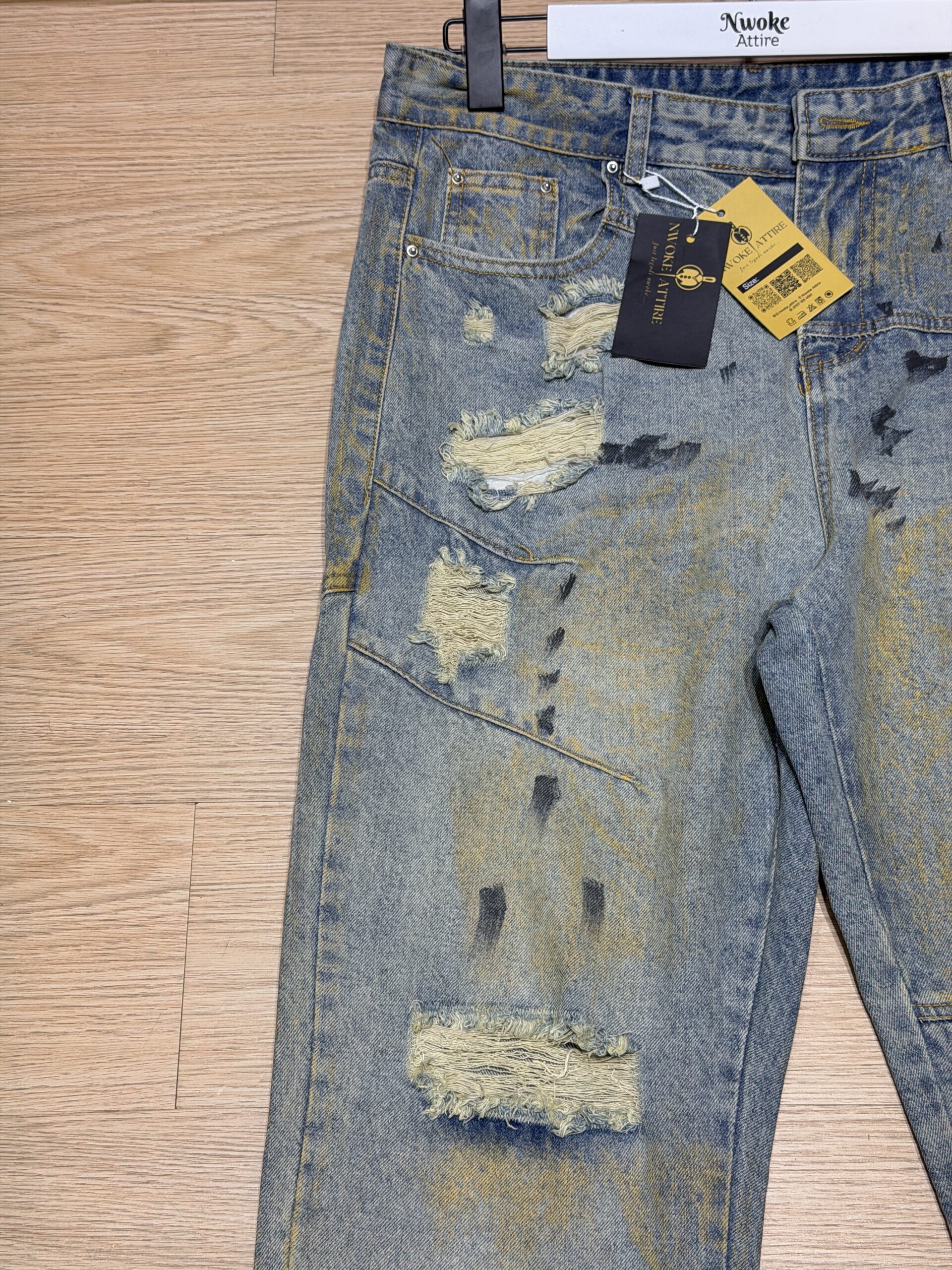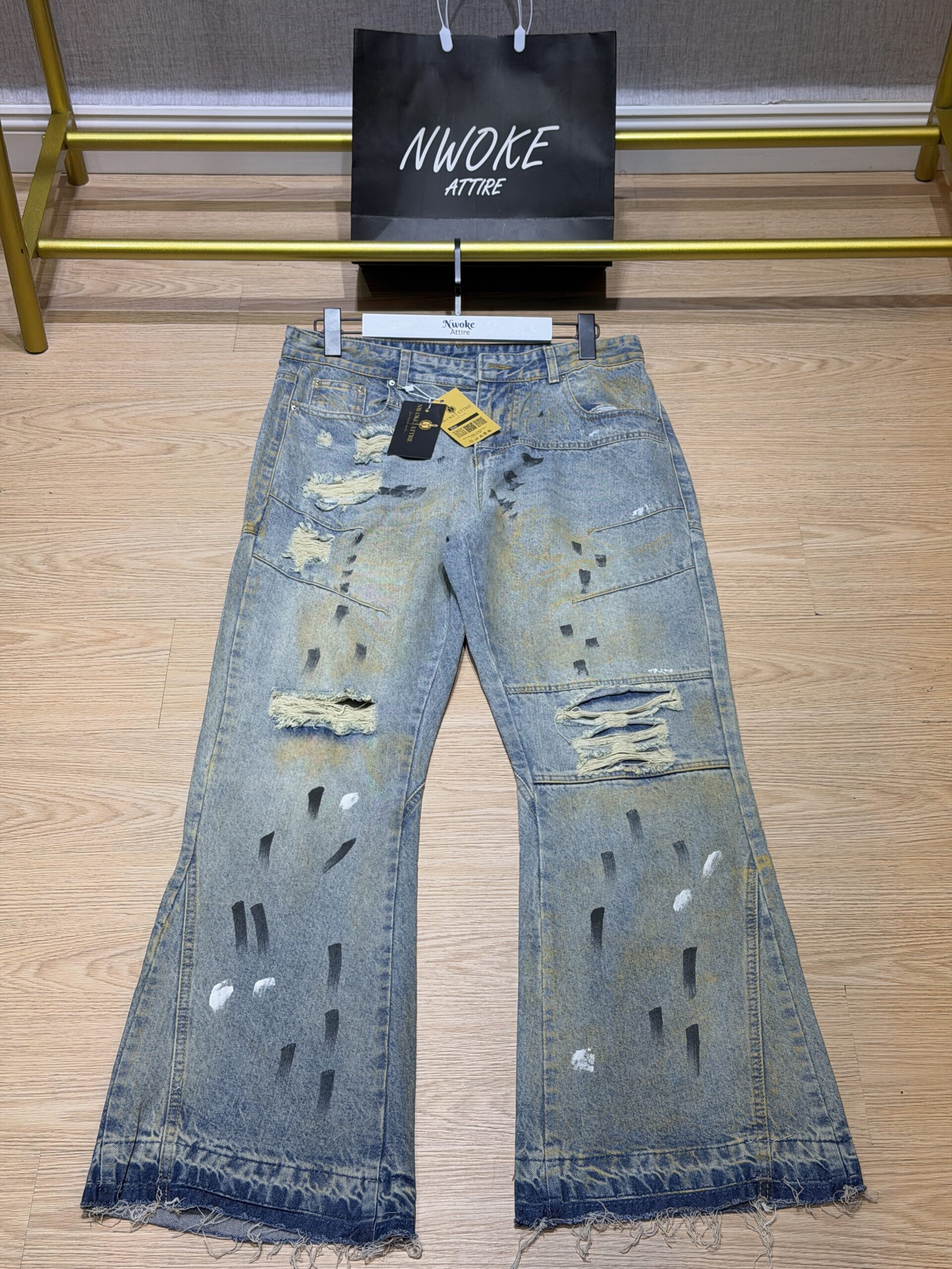 Make a striking, custom statement with the Blue Washed Boot-cut Denim from Nwoke Attire. These trousers are the ultimate expression of creative street style, combining classic, wide-leg denim with heavy distressing and unique painted details. Perfect for those seeking a one-of-a-kind, attention-grabbing aesthetic.