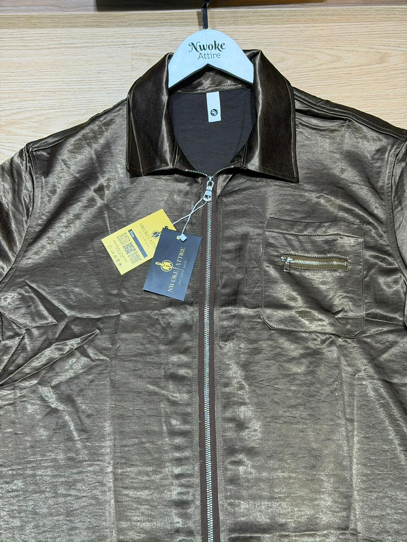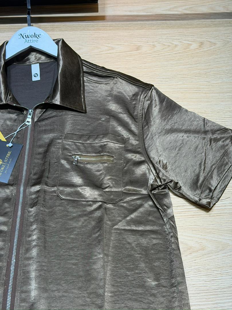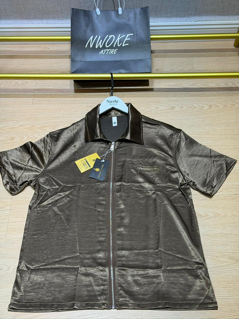 Introduce a touch of luxurious, metallic fluidity to your wardrobe with the Brown Turkey Silk Shirt from Nwoke Attire. This short-sleeved top transcends typical casual wear, featuring a fabric with a stunning shimmering, liquid appearance that catches the light with every movement. Crafted with precision in Turkey, it delivers a premium, eye-catching look perfect for evening wear or high-fashion street style.