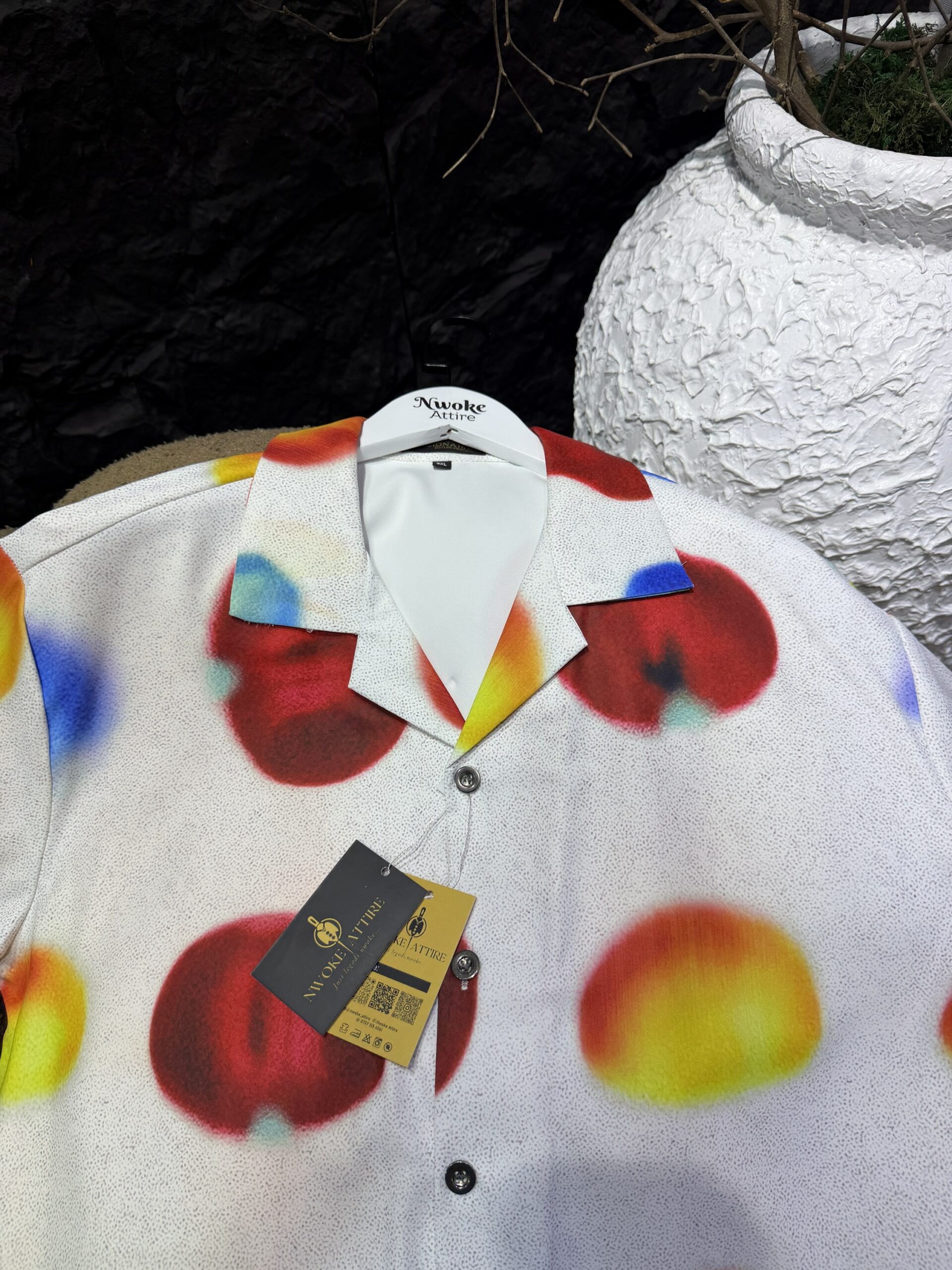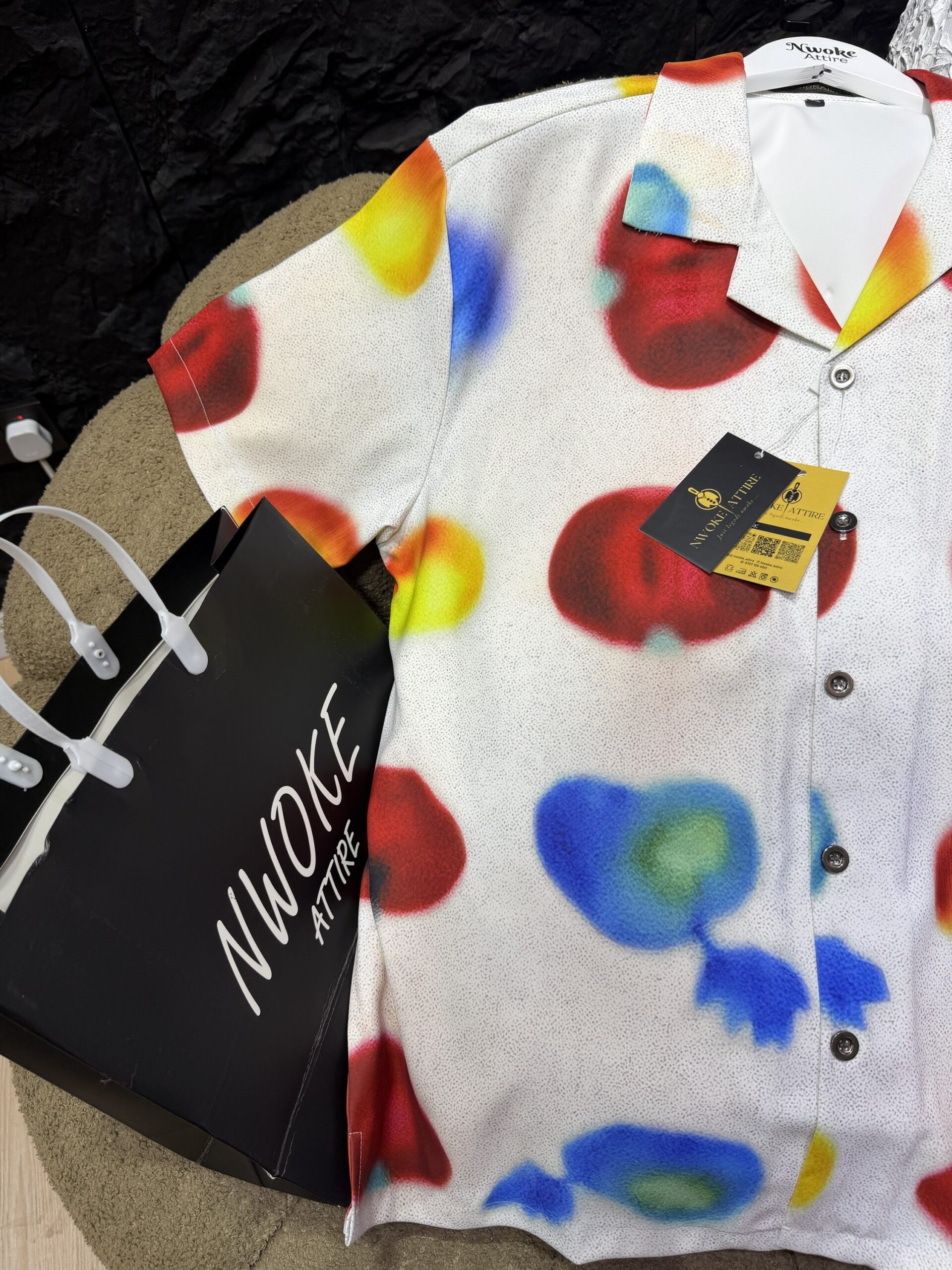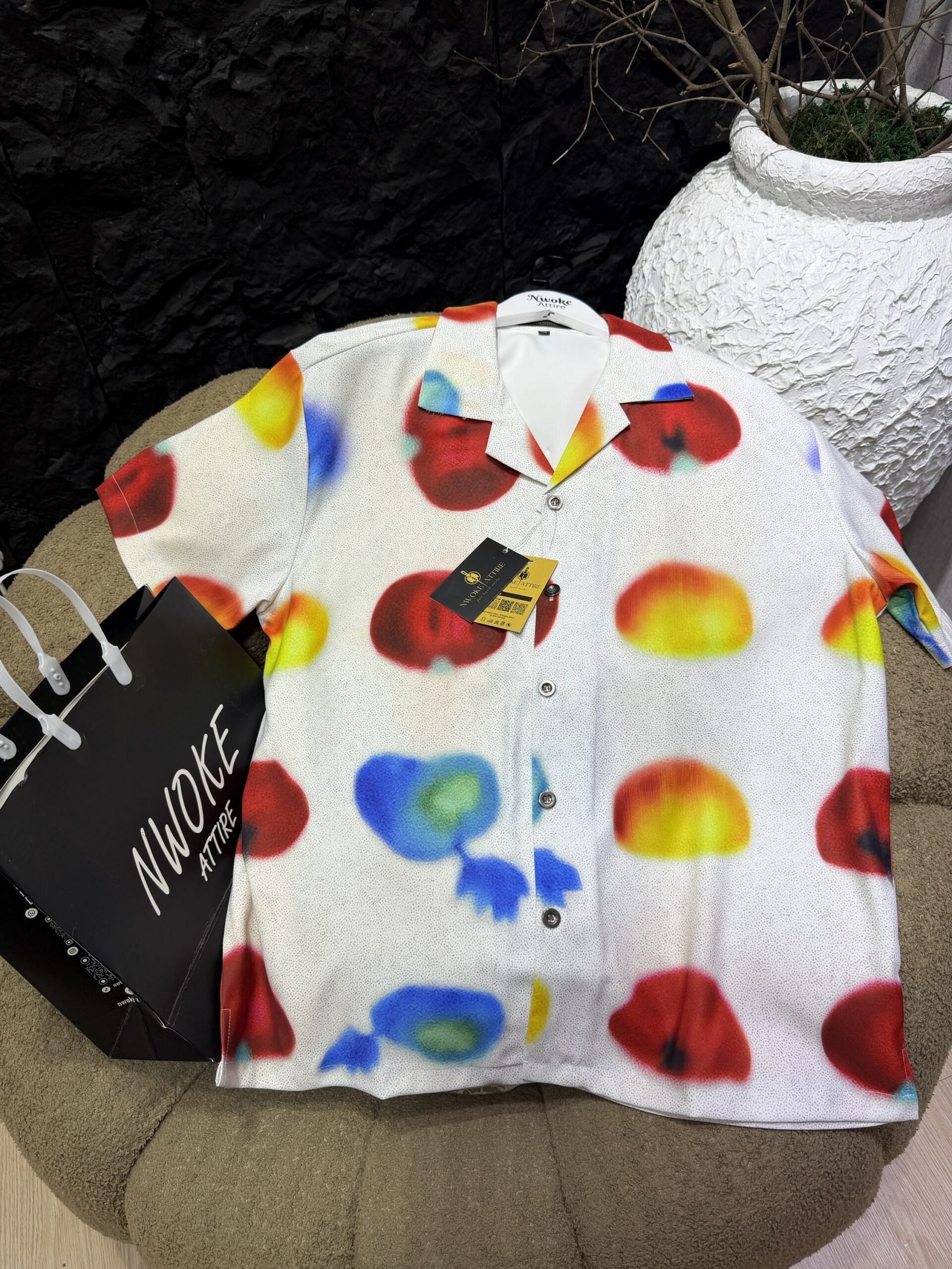 The Chromatic Drift Cuban Shirt is a bold expression of modern artistry and relaxed luxury. Set on a soft ivory base, the shirt features fluid, abstract color washes in vibrant red, blue, yellow, and green—creating a dynamic, hand-painted effect that feels expressive yet refined.