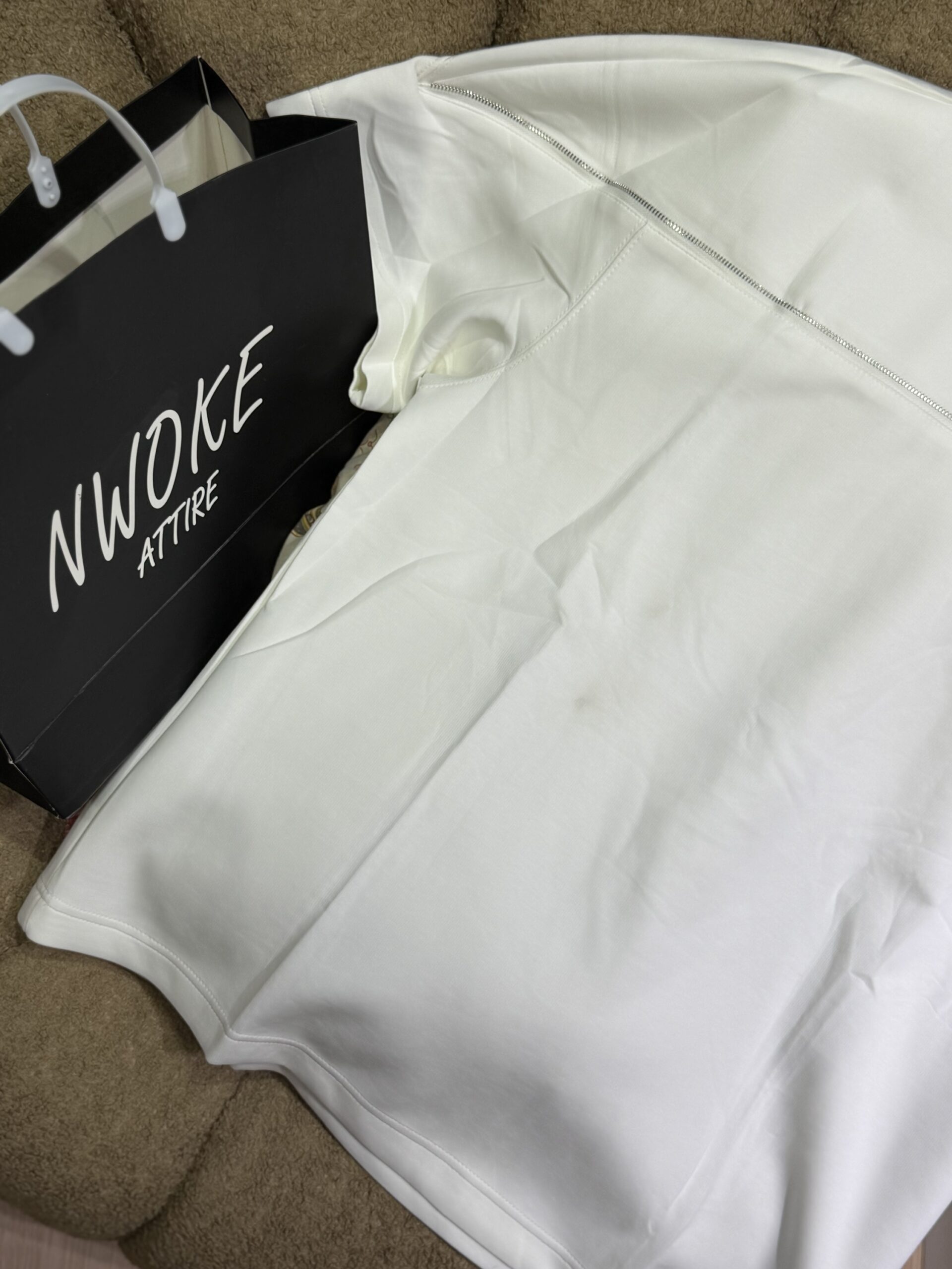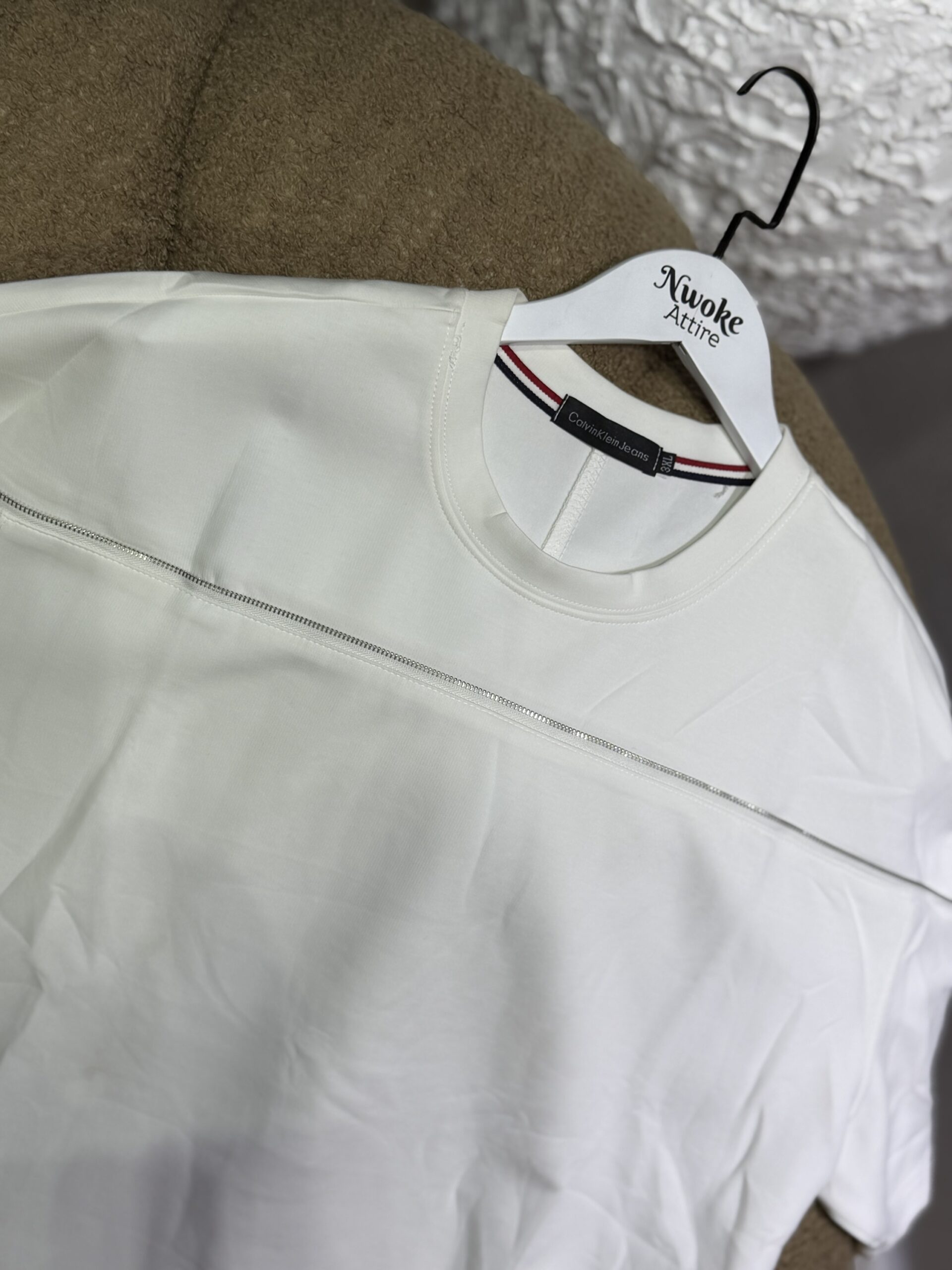 A classic White zip pattern short-sleeve polo available in XXL crafted from smooth premium fabric. It offers a sleek, modern look perfect for formal events or elevated smart-casual wear. Priced at 60,000