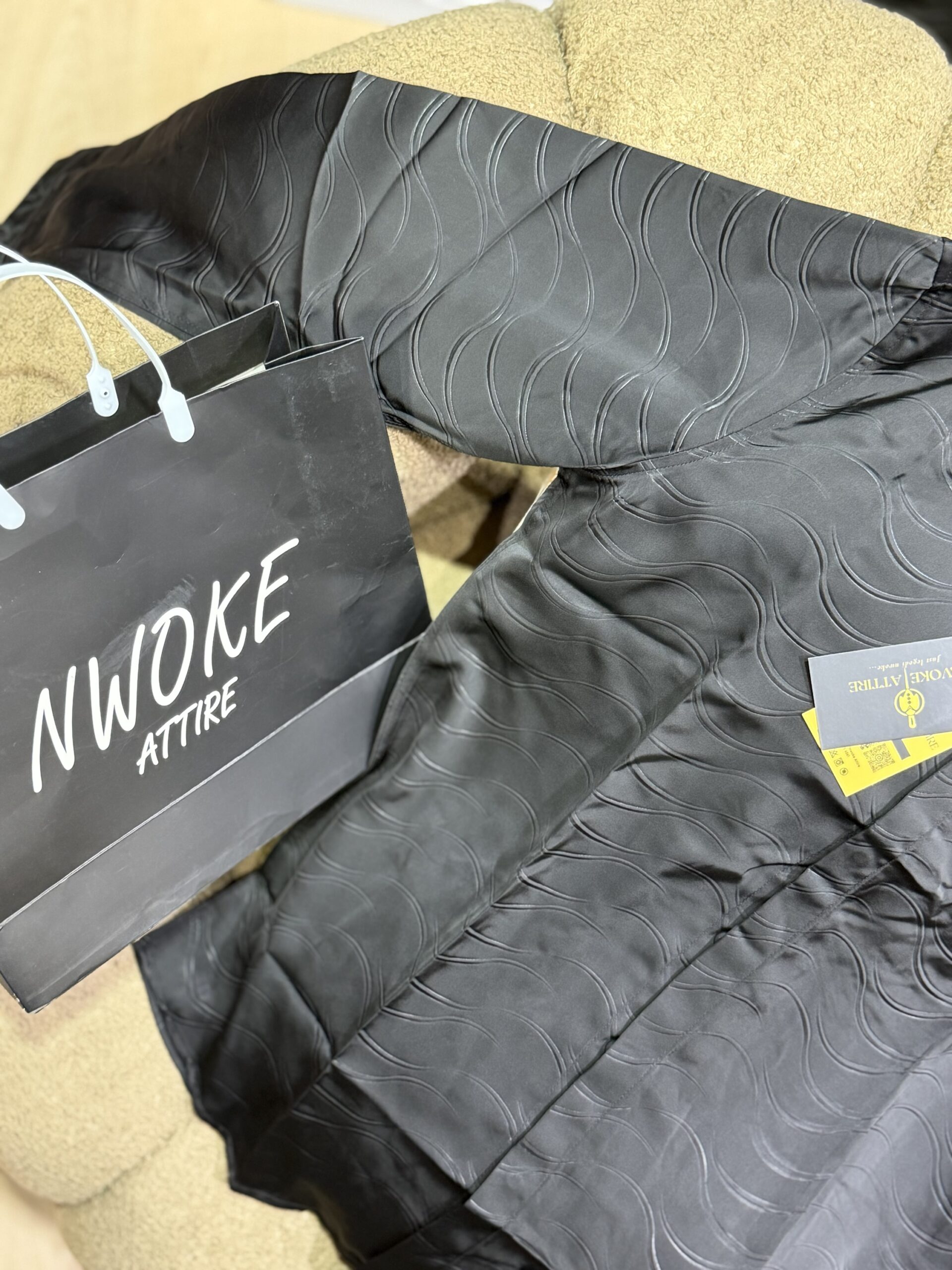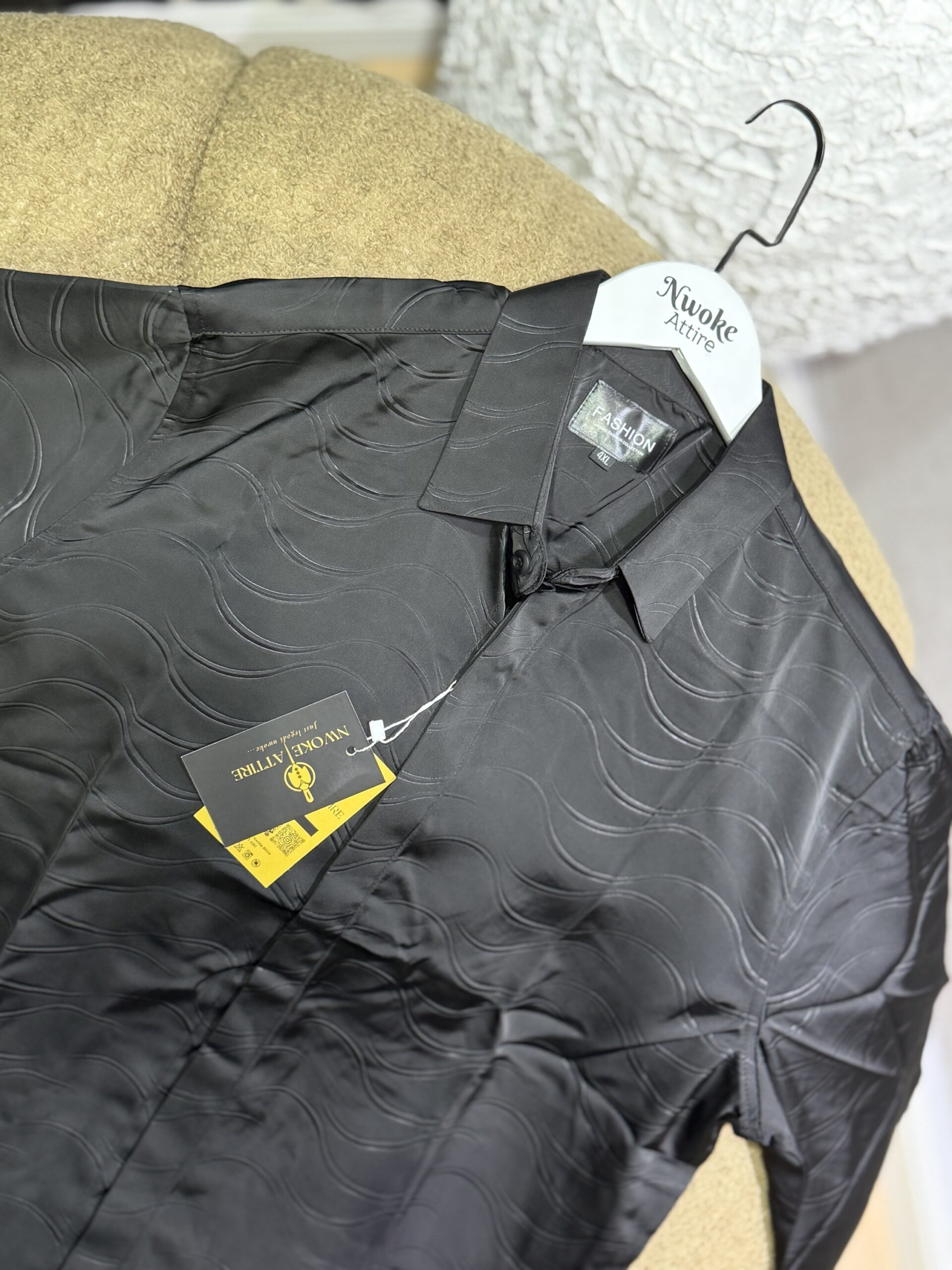 A classic black long-sleeve shirt available in XXL / XXXL crafted from smooth premium fabric with a subtle wave-textured pattern. Finished with a sharp collar and clean button-down front, it offers a sleek, modern look perfect for formal events or elevated smart-casual wear.