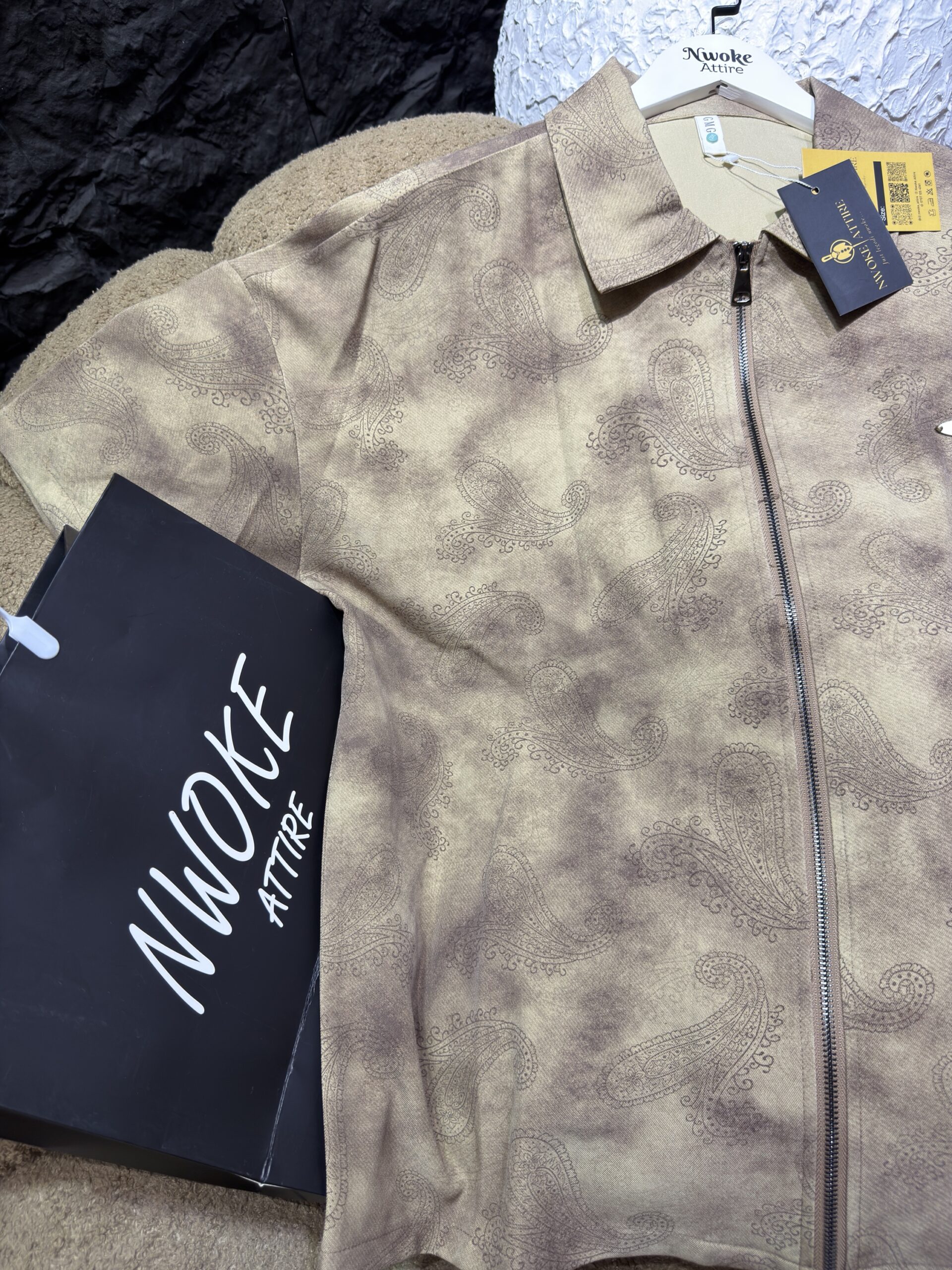 Paisley Zip-Up Polo Shirt featuring a subtle all-over paisley print, crafted from lightweight breathable fabric. Designed with a sleek front zipper and structured collar, it delivers a refined smart-casual look with effortless sophistication. Size; 3XL